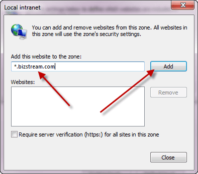 8) Enter “*.bizstream.com” into the “Add this website to the zone” textbox and click “Add”. (Using *.bizstream.com will allow this to work for your beta site as well.)