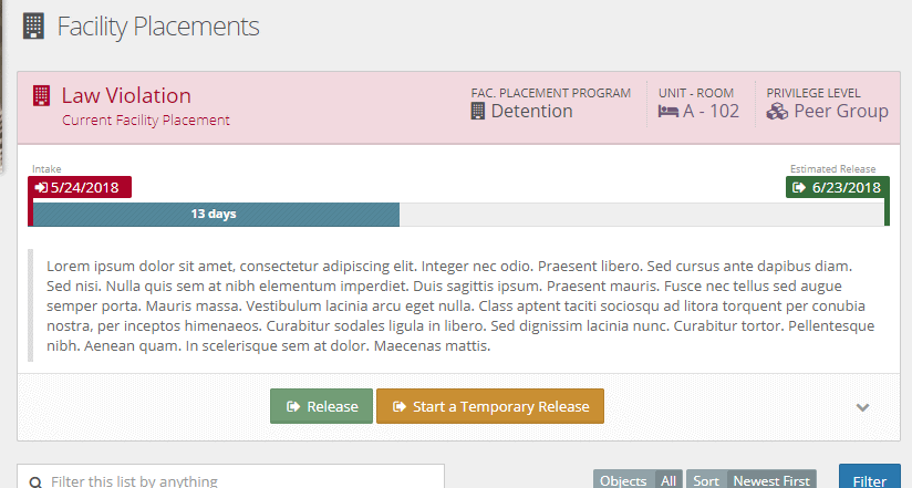 Immediately below the pink header is a placement progress bar. This bar starts with the Intake Date in red at the left and the Estimated Release Date (if entered) in green at the right. In between those two dates is a progress bar counting the number of days accumulated in the placement so far. This gives you a quick view of how close the client is to being released.