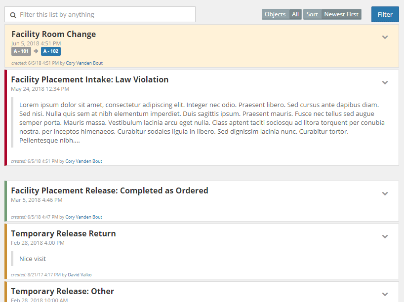 Below the current placement area is a listing of all Facility Placement releated events like Intake (marked in red), Program Change, Room Change, Privilege Level Change, Temporary Release and Return (marked in yellow), and Release (marked in green). Each item in the list displays relevant information and allows you to view/edit/delete it.