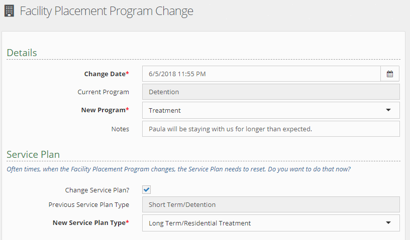 Service Plans also reset on Facility Placement Program change. On change you’ll be prompted to create a new Initial Plan and start the Updated Plan schedule.