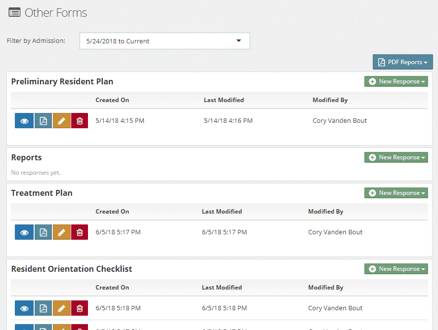 In the top left you’ll see the Reason for Intake. Then in the top right are the current Placement Program, Room, and Privilege Level. Each of those three items are clickable and you will be brought to the page on which you can change each value (program, room, or level).