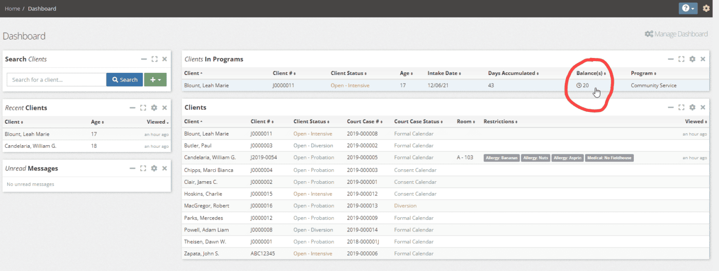 You can add multiple widgets to your dashboard, filtered by program if you’d like or have all under one widget. The in the example above, we’re only showing clients in the Community Service program.