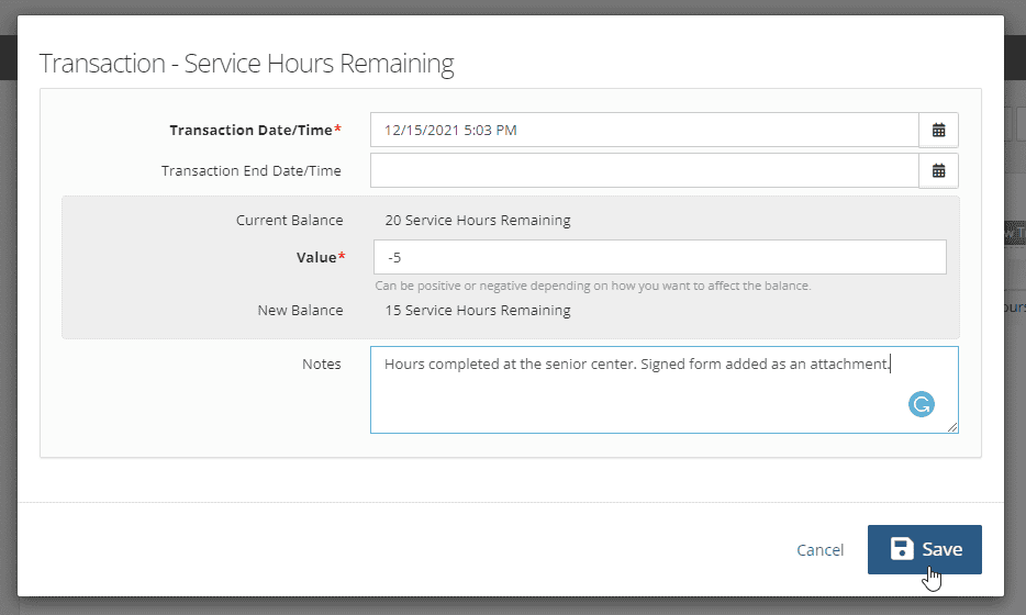 The transaction dialogue will open up. To start, you will add the initial balance. In this case, we’re adding 20 hours of community service to the client. Click the save button to add the transaction and see the new balance.