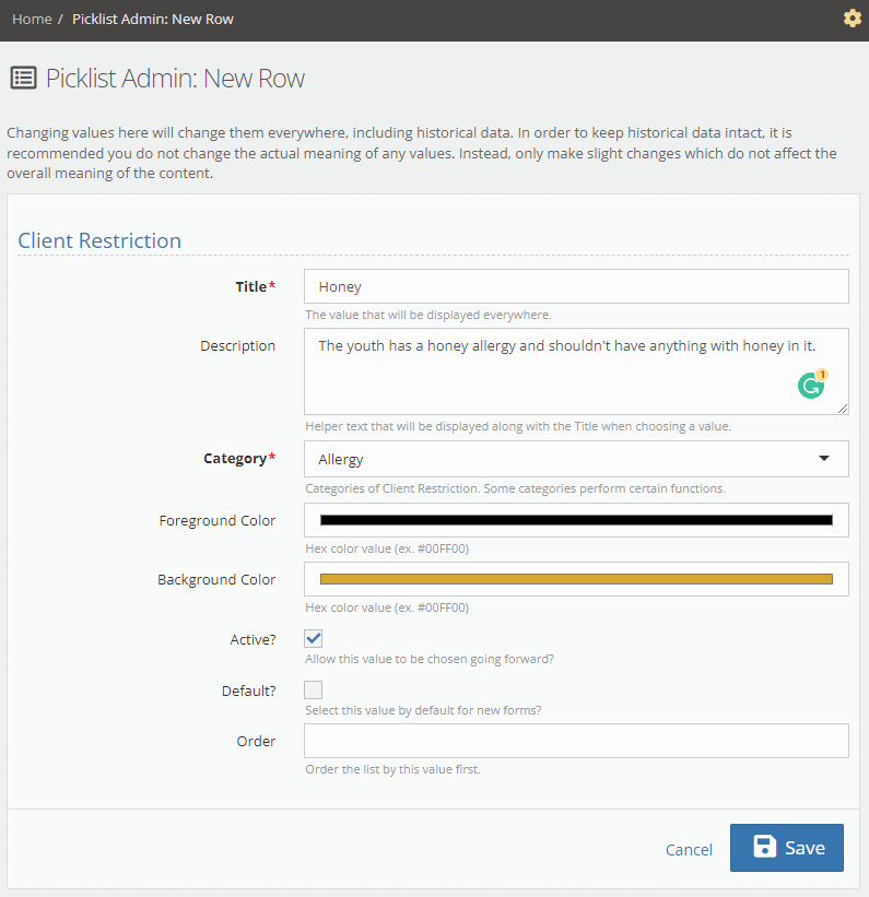 Administrators can add restrictions for use in YouthCenter by using the Picklist Admin, filtering by restriction, then selecting “client restriction”