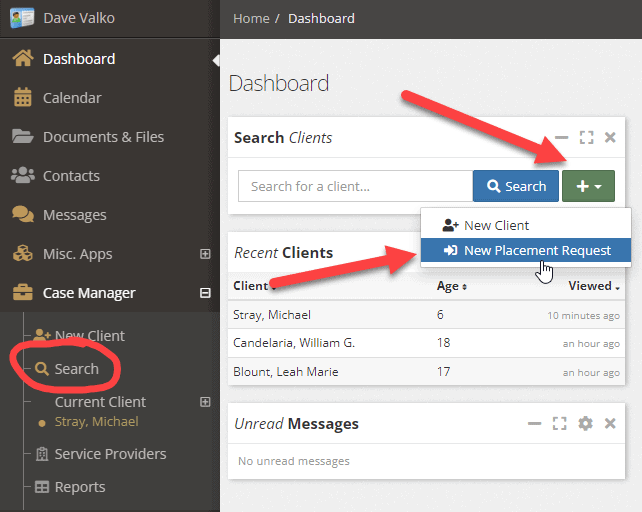 To add a new placement request, from the dashboard or the Search under Case Manager, select “New Placement Request”.
