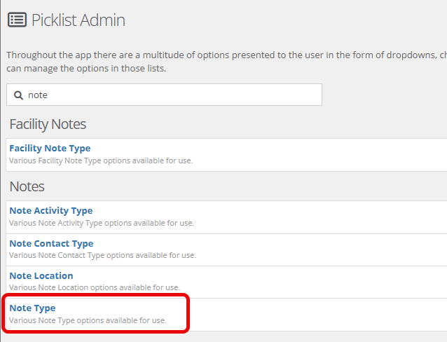 Step 2: Using the search bar or by searching through the full list, find and choose “note type.”