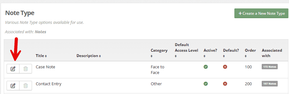 Step 3: Choose the note type you’d like to set a default access level for. Select the “edit this row” option.