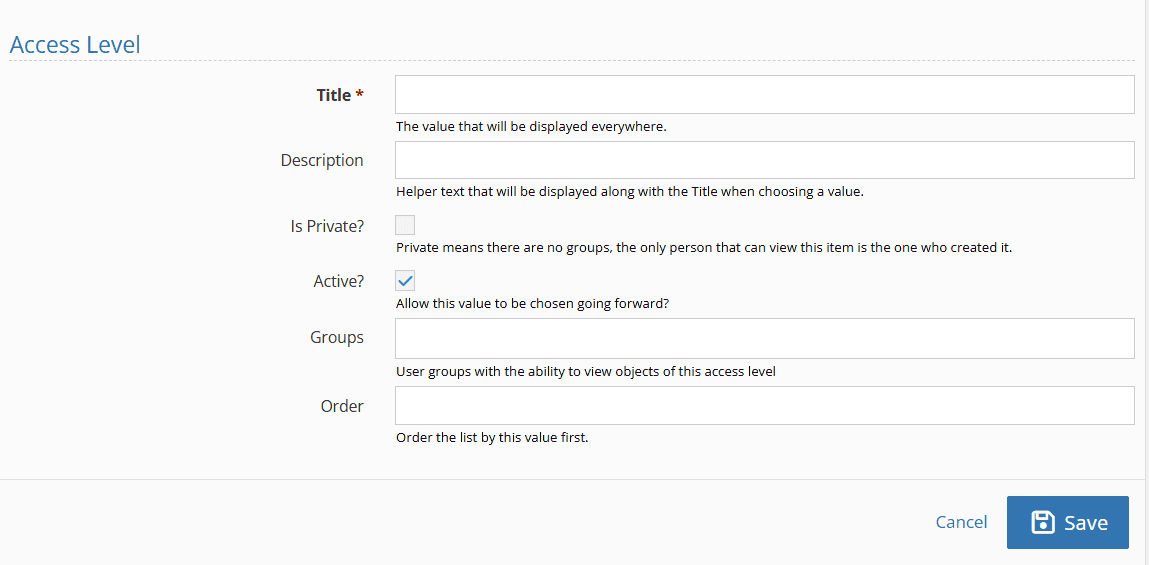 - Order: the order in which this particular access level falls in the dropdown menu.