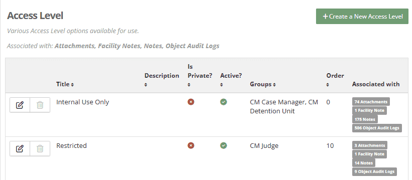 Below are two examples of created Access Levels that could be used in one of the 4 features in YouthCenter.