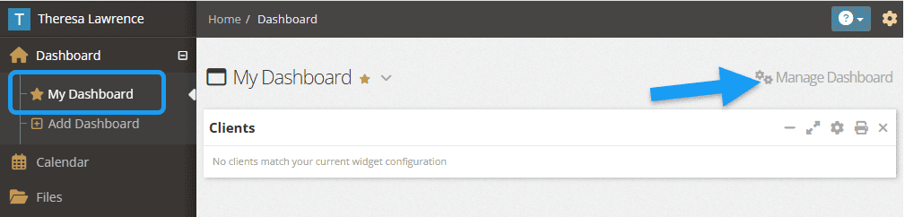 Step 1: Choose the dashboard you would like to modify/add a new widget to, and select “Manage Dashboard.”