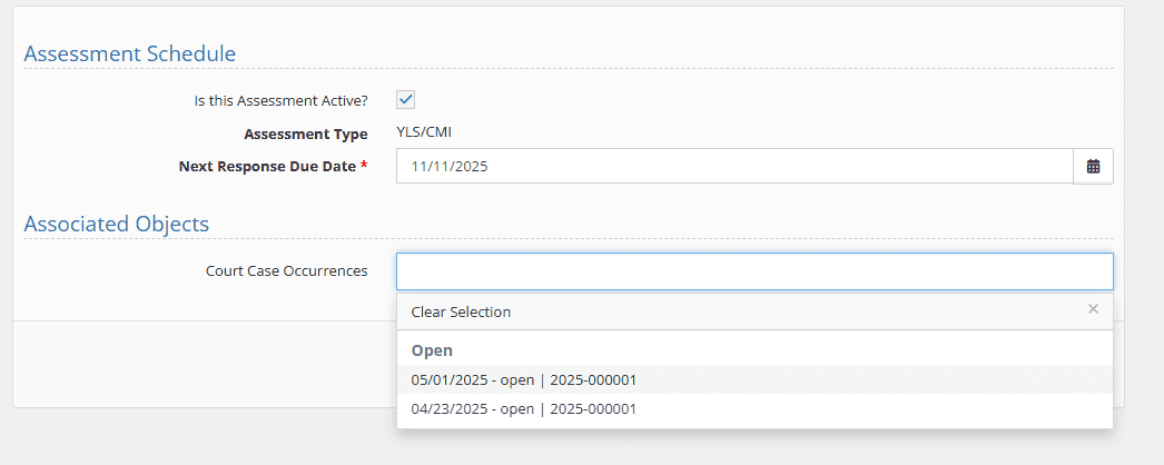 Users can now associate a single record (such as an assessment or placement) with multiple court case occurrences at once. The selection control now displays both the occurrence date and case number, making it easier to identify the correct entries. This eliminates the need to create duplicate records for each petition.