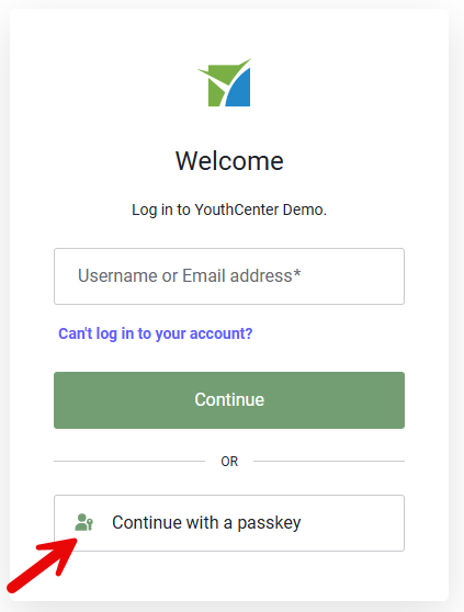 As a reminder, login is now a two button process instead of one for users using username and password. You will first be asked to enter your username or email address, and then after pressing continue, then you will be taken to either your passkey or password login check.