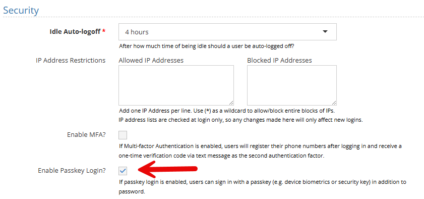 For sites with the appropriate packages, administrators can now enable passkey login for their site under General Settings → Security. When enabled, users can sign in using biometrics (fingerprint, Face ID) or a hardware security key instead of a traditional password. Administrators can also reset a user’s passkey from the User Manager if the user is locked out or needs to re-enroll.